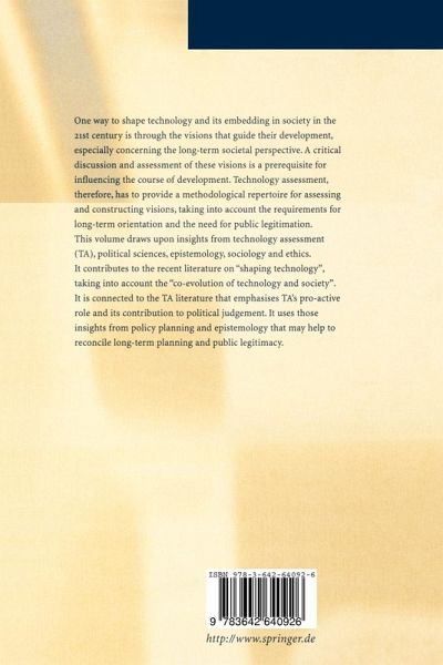 One way to shape technology and its embedding in society in the 21st century is through the visions that guide their development, especially concerning the long-term societal perspective. A critical discussion and assessment of these visions is a prerequisite for influencing the course of development. Technology assessment, therefore, has to provide a methodological repertoire for assessing and constructing visions, taking into account the requirements for long-term orientation as well as the need for public legitimation. This volume draws upon insights from technology assessment, political sciences, epistemology, sociology and ethics. It is to contribute to the recent literature in on "shaping technology", taking into account the "co-evolution of technology and society". It connects to that technology assessment literature that emphasises TA's pro-active role and its contribution to political judgement.