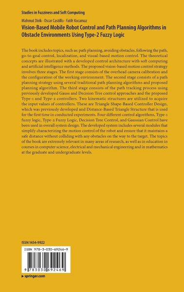 The book includes topics, such as: path planning, avoiding obstacles, following the path, go-to-goal control, localization, and visual-based motion control. The theoretical concepts are illustrated with a developed control architecture with soft computing and artificial intelligence methods. The proposed vision-based motion control strategy involves three stages. The first stage consists of the overhead camera calibration and the configuration of the working environment. The second stage consists of a path planning strategy using several traditional path planning algorithms and proposed planning algorithm. The third stage consists of the path tracking process using previously developed Gauss and Decision Tree control approaches and the proposed Type-1 and Type-2 controllers. Two kinematic structures are utilized to acquire the input values of controllers. These are Triangle Shape-Based Controller Design, which was previously developed and Distance-BasedTriangle Structure that is used for the first time in conducted experiments. Four different control algorithms, Type-1 fuzzy logic, Type-2 Fuzzy Logic, Decision Tree Control, and Gaussian Control have been used in overall system design. The developed system includes several modules that simplify characterizing the motion control of the robot and ensure that it maintains a safe distance without colliding with any obstacles on the way to the target. The topics of the book are extremely relevant in many areas of research, as well as in education in courses in computer science, electrical and mechanical engineering and in mathematics at the graduate and undergraduate levels.