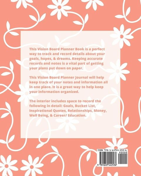 This Vision Board Planner is a great tool to help you set and achieve your goals for the new year and start in January or any other month you choose. The law of attraction is the belief that positive thoughts bring positive experiences into a person's life. It is an attractive, magnetic power that draws similar energies together and allows people to manifest their own dreams and desires. That's why it's so important to visualize what you want out of life and to write it down. That's where using a vision board planner will come into play. Each vision board page includes space and prompts for: Goals Bucket List Inspirational Quotes Relationships Money Well Being Career/ Education In each section you can write your goal, draw a picture or paste any cut outs. Each vision board page is followed by a blank lined journal page for writing any important information or feelings, such as feelings of gratitude, your favorite affirmations or even goals for work. Vision boards can help you create the life you want and keep yourself on track. You can use this journal weekly or monthly. Easy to use. Get started in the right direction and get one today or give as a gift. Size is 8x10 inches, 106 pages, soft matte finish cover.