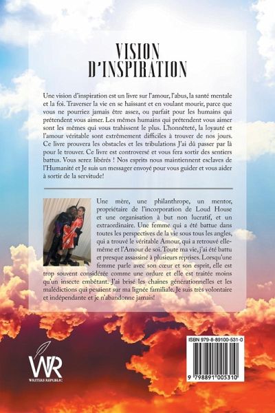 Une vision d'inspiration est un livre sur l'amour, l'abus, la santé mentale et la foi. Traverser la vie en se haïssant et en voulant mourir, parce que vous ne pourriez jamais être assez, ou parfait pour les humains qui prétendent vous aimer. Les mêmes humains qui prétendent vous aimer sont les mêmes qui vous trahissent le plus. L'honnêteté, la loyauté et l'amour véritable sont extrêmement difficiles à trouver de nos jours. Ce livre prouvera les obstacles et les tribulations J'ai dû passer par là pour le trouver. Ce livre est controversé et vous fera sortir des sentiers battus. Vous serez libérés ! Nos esprits nous maintiennent esclaves de l'Humanité et Je suis un messager envoyé pour vous guider et vous aider à sortir de la servitude!