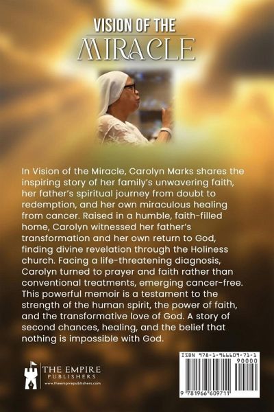 In this inspiring memoir, Carolyn Marks recounts the powerful story of her family's unwavering faith, the struggles of her father's spiritual journey, and her own miraculous healing from cancer. Raised in a humble, faith-filled household, Carolyn witnessed the profound transformation of her father, from a dedicated Elder in the Jehovah's Witness community to a man lost in doubt and eventually redeemed by grace. As Carolyn navigates the painful decline of her father's faith and his eventual return to God through a Holiness church, she too finds her own path to divine revelation. What follows is a powerful story of personal transformation, family unity, and the undeniable presence of God in their lives. Alongside her family's spiritual journey, Carolyn also shares the personal battle with cancer that tested her body and faith. Faced with a life-threatening diagnosis, she chose an unconventional treatment path, relying not on traditional medical methods alone, but on prayer and God's grace to heal her. Against all odds, Carolyn emerged cancer-free, a living testament to the power of faith, redemption, and divine healing. Vision of the Miracle is a profound testament to the strength of the human spirit, the enduring power of faith, and the miraculous ways in which God's love can transform lives. This is a story of second chances, healing, and a family's unwavering belief that nothing is impossible with God.