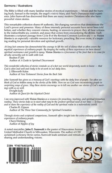 * What if Moses had never told anyone about the burning bush? * What if Paul had kept quiet about his experience on the road to Damascus? * What if John had never written a word of what he saw during his exile on Patmos? The Bible is filled with mystical stories, yet modern culture is often uncomfortable with the concept of spiritual visions. Though a recent study showed that as many as 44% of Americans have had some sort of mystical experience, people are frequently hesitant to share holy moments that might seem strange to others. But John Sumwalt discovered that whenever a small group is gathered together and a vision story is told, two or three others will recount a similar episode. Almost everyone has either a personal vision story or knows of a friend's experience -- and if they know that its sacredness will be honored, most people want to tell their story. This remarkable collection shares 69 authentic, life-changing narratives that witness to the Lord's power and presence. Many of these intensely personal accounts have never been told before, and whether they concern visions, healing, or answers to prayer, they all demonstrate our spiritual thirst, as well as the indescribable joy, comfort, and peace that comes from encountering the divine. Each illustrates a scripture passage from Cycle B of the Revised Common Lectionary -- so Vision Stories is an especially valuable resource for lectionary preaching. But even more, it's inspiring reading for personal devotion and spiritual growth. This wonderful collection of stories reminds us of a fact our world desperately needs to know -- that God is alive and well and ready to be at work in our daily lives. J. Ellsworth Kalas Author of New Testament Stories from the Back Side John Sumwalt has given us a treasury of God's meetings with the daily lives of people. Too often we think of God as hidden away in the stories of the Bible. Here we see God now encountering people in surprising ways of grace. May these stories encourage us to tell one another our stories of God's meetings with us as well. Dwight Judy Author of Quest for the Mystical Christ I am very impressed with Vision Stories as a resource for preaching, teaching, and spiritual formation reading. These stories help us to meet what may be the greatest spiritual need of our time -- to know and to share the experience of the reality of God and the spiritual realm in a materialistic world. Charles R. Gipson Author of The Three-Year Community for Spiritual Formation Through stories and scriptural comparisons, Sumwalt offers insight into the extraordinary spiritual experiences of ordinary people. Cheryl Kirking Author of Ripples of Joy A noted storyteller, John E. Sumwalt is the senior pastor of Wauwatosa Avenue United Methodist Church in Milwaukee, Wisconsin. The author of CSS' acclaimed Lectionary Stories series, Sumwalt leads seminars and retreats on sharing and understanding visions.