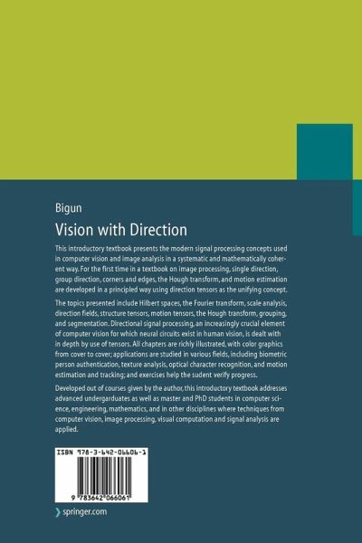 Human and Computer Vision.- Neuronal Pathways of Vision.- Color.- Linear Tools of Vision.- Discrete Images and Hilbert Spaces.- Continuous Functions and Hilbert Spaces.- Finite Extension or Periodic Functions-Fourier Coefficients.- Fourier Transform-Infinite Extension Functions.- Properties of the Fourier Transform.- Reconstruction and Approximation.- Scales and Frequency Channels.- Vision of Single Direction.- Direction in 2D.- Direction in Curvilinear Coordinates.- Direction in ND, Motion as Direction.- World Geometry by Direction in N Dimensions.- Vision in Multiple Directions.- Group Direction and N-Folded Symmetry.- Grouping, Segmentation, and Region Description.- Reducing the Dimension of Features.- Grouping and Unsupervised Region Segregation.- Region and Boundary Descriptors.- Concluding Remarks.