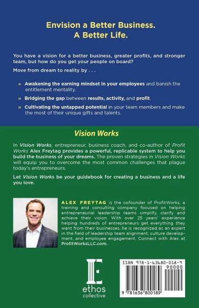 Envision a Better Business. A Better Life. You have a vision for a better business, greater profits, and stronger team, but how do you get your people on board? How do you move from dream to reality? Vision Works. In Vision Works, entrepreneur, business consultant, and co-author of Profit Works Alex Freytag provides a powerful, replicable system to help you build the business of your dreams. The proven strategies in Vision Works will equip you to overcome the most common challenges that plague today's entrepreneurs. You will learn how to: Awaken the earning mindset in your employees and banish the entitlement mentality. Bridge the gap between results, activity, and profit. Cultivate the untapped potential in your team members and make the most of their unique gifts and talents. Let Vision Works be your guidebook for creating a business and a life you love.