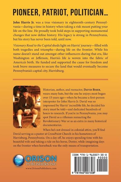 Pioneer, patriot, politician... John Harris Jr. was a true visionary in eighteenth-century Pennsylvania-during a time in history when taking a risk meant putting your life on the line. He proudly took bold steps in supporting monumental changes that now define history. His legacy is strong in Pennsylvania, but his story has never been told, until now. Visionary Road to the Capital sheds light on Harris' journey-filled with both tragedies and triumphs-during life on the frontier. While his name doesn't stand out amongst other influencers during that era, like Washington or Jefferson, Harris' life is woven into the fabric of America's birth. He funded and supported the cause for freedom and took brave measures to secure the land that would eventually become Pennsylvania's capital city, Harrisburg.