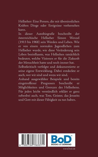 Hellseher: Eine Person, die mit übersinnlichen Kräften Dinge oder Ereignisse vorhersehen kann.In dieser Autobiografie beschreibt der österreichische Hellseher Simon Wenzel (1913 bis 1968) sein Werden und Leben. Wie er von einem normalen Jugendlichen zum Hellseher wurde, wie diese Veränderung sein Leben beeinflusste, was Hellsehen tatsächlich bedeutet, welche Visionen er für die Zukunft der Menschheit hatte und noch immer hat.Selbstkritisch verfolgte und dokumentierte er seine eigene Entwicklung. Dabei entdeckte er auch, wer wir sind und wozu wir sind.Anhand ausgewählter Beispiele und bereits eingetroffener Prognosen beschreibt er Möglichkeiten und Grenzen des Hellsehens. Für jeden leicht verständlich erklärt er ganz nebenbei auch, was Tote, Geister, das Jenseits und Gott mit dieser Fähigkeit zu tun haben.