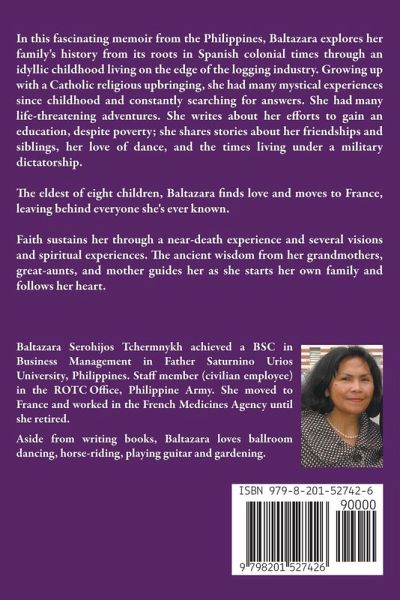 In this fascinating memoir from the Philippines, Baltazara Tchermnykh explores her family's history from its roots in Spanish colonial times through an idyllic childhood living on the edge of the logging industry. She writes about her efforts to gain an education, despite poverty; she shares stories about her friendships and siblings, her love of dance, and the times living under a military dictatorship. The eldest of eight children, Baltazara finds love and moves to France, leaving behind everyone she's ever known. Faith sustains her through a near-death experience and a number of visions and spiritual experiences. The ancient wisdom from her grandmothers, great-aunts, and mother guides her as she starts her own family and follows her heart.