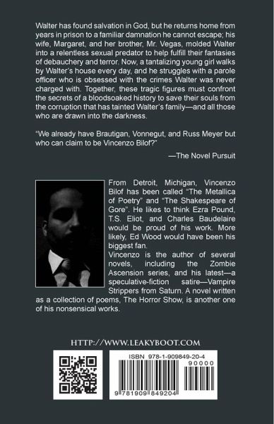 Walter has found salvation in God, but he returns home from years in prison to a familiar damnation he cannot escape; his wife, Margaret, and her brother, Mr. Vegas, molded Walter into a relentless sexual predator to help fulfill their fantasies of debauchery and terror. Now, a tantalizing young girl walks by Walter's house every day, and he struggles with a parole officer who is obsessed with the crimes Walter was never charged with. Together, these tragic figures must confront the secrets of a bloodsoaked history to save their souls from the corruption that has tainted Walter's family-and all those who are drawn into the darkness. From Detroit, Michigan, Vincenzo Bilof has been called "The Metallica of Poetry" and "The Shakespeare of Gore". He likes to think Ezra Pound, T.S. Eliot, and Charles Baudelaire would be proud of his work. More likely, Ed Wood would have been his biggest fan. Vincenzo is the author of several novels, including the Zombie Ascension series, and his latest-a speculative-fiction satire-Vampire Strippers from Saturn. A novel written as a collection of poems, The Horror Show, is another one of his nonsensical works.