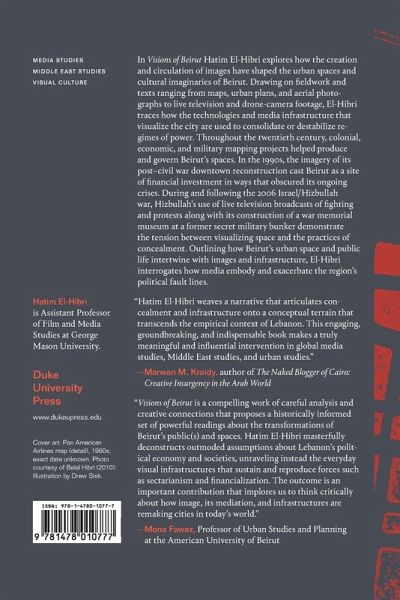 In Visions of Beirut Hatim El-Hibri explores how the creation and circulation of images have shaped the urban spaces and cultural imaginaries of Beirut. Drawing on fieldwork and texts ranging from maps, urban plans, and aerial photographs to live television and drone-camera footage, El-Hibri traces how the technologies and media infrastructure that visualize the city are used to consolidate or destabilize regimes of power. Throughout the twentieth century, colonial, economic, and military mapping projects helped produce and govern Beirut's spaces. In the 1990s, the imagery of its post-civil war downtown reconstruction cast Beirut as a site of financial investment in ways that obscured its ongoing crises. During and following the 2006 Israel/Hizbullah war, Hizbullah's use of live television broadcasts of fighting and protests along with its construction of a war memorial museum at a former secret military bunker demonstrate the tension between visualizing space and the practices of concealment. Outlining how Beirut's urban space and public life intertwine with images and infrastructure, El-Hibri interrogates how media embody and exacerbate the region's political fault lines.