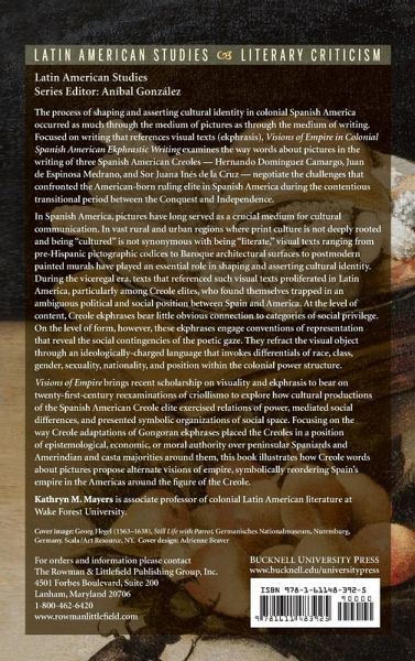 The process of shaping and asserting cultural identity in viceregal Spanish America occurred as much through the medium of pictures as through the medium of writing. Focused on writing that references visual texts (ekphrasis), Visions of Empire in Colonial Spanish American Ekphrastic Writing examines the way words about pictures in the writing of three Spanish American Creoles-Hernando Domínguez Camargo, Juan de Espinosa Medrano, and Sor Juana Inés de la Cruz-negotiate the challenges that confronted the American-born ruling elite in Spanish America during the contentious transitional period between the Conquest and Independence. In Spanish America, pictures have long served as a crucial medium for cultural communication. In vast rural and urban regions where print culture is not deeply rooted and being "cultured" is not synonymous with being "literate," visual texts ranging from pre-Hispanic pictographic codices to Baroque architectural surfaces to postmodern painted murals have played an essential role in shaping and asserting cultural identity. During the viceregal era, texts that referenced such visual texts proliferated in Latin America, particularly among Creole elites, who found themselves trapped in an ambiguous political and social position between Spain and America. At the level of content, Creole ekphrases bear little obvious connection to categories of social privilege. On the level of form, however, these ekphrases engage conventions of representation that reveal the social contingencies of the poetic gaze. They refract the visual object through an ideologically-charged language that invokes differentials of race, class, gender, sexuality, nationality, and position within the colonial power structure. Visions of Empire brings recent scholarship on visuality and ekphrasis to bear on twenty-first-century reexaminations of criollismo to explore how cultural productions of the Spanish American Creole elite exercised relations of power, mediated social differences, and presented symbolic organizations of social space. Focusing on the way Creole adaptations of Gongoran ekphrases placed the Creoles in a position of epistemological, economic, or moral authority over peninsular Spaniards and Amerindian and casta majorities around them, this book illustrates how Creole words about pictures propose alternate visions of empire, symbolically reordering Spain's empire in the Americas around the figure of the Creole.