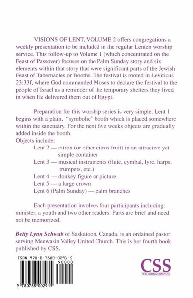 Visions of Lent Year 2 -- Sukkot (Feast of Tabernacles) offers congregations a weekly presentation to be included in the regular Lenten worship service. This follow-up to Volume 1 (which concentrated on the Feast of Passover) focuses on the Palm Sunday story and six elements within that story that were significant parts of the Jewish Feast of Tabernacles or Booths. The festival is rooted in Leviticus 23:33f, where God commanded Moses to declare the festival to the people of Israel as a reminder of the temporary shelters they lived in when He delivered them out of Egypt. Preparation for this worship series is very simple. Lent 1 begins with a plain, "symbolic" booth placed somewhere within the sanctuary. For the next five weeks objects are gradually added inside the booth. Objects include: Lent 2 -- citron (or other citrus fruit) in an attractive yet simple container Lent 3 -- musical instruments (flute, cymbal, lyre, harps, trumpets, etc.) Lent 4 -- donkey figure or picture Lent 5 -- a large crown Lent 6 (Palm Sunday) -- palm branches Each presentation involves four participants including: minister, a youth, and two other readers. Parts are brief and need not be memorized. Betty Lynn Schwab of Saskatoon. Canada, is an ordained pastor serving Meewasin Valley United Church. This is her fourth book published by CSS.