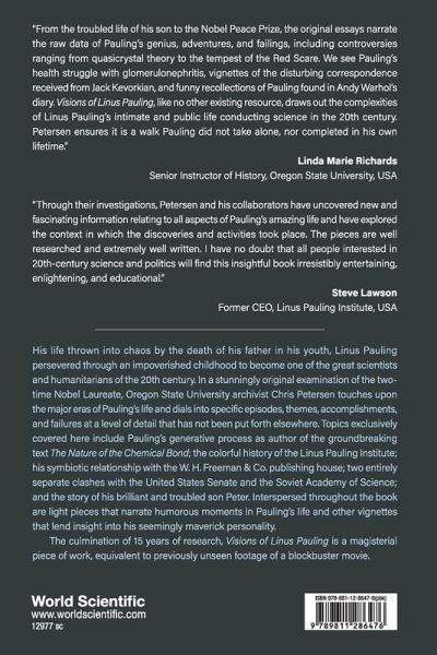 His life thrown into chaos by the death of his father in his youth, Linus Pauling persevered through an impoverished childhood to become one of the great scientists and humanitarians of the 20th century. In a stunningly original examination of the two-time Nobel Laureate, Oregon State University archivist Chris Petersen touches upon the major eras of Pauling's life and dials into specific episodes, themes, accomplishments, and failures at a level of detail that has not been put forth elsewhere. Topics exclusively covered here include Pauling's generative process as author of the groundbreaking text The Nature of the Chemical Bond; the colorful history of the Linus Pauling Institute; his symbiotic relationship with the W H Freeman & Co. publishing house; two entirely separate clashes with the United States Senate and the Soviet Academy of Science; and the story of his brilliant and troubled son Peter. Interspersed throughout the book are light pieces that narrate humorous moments in Pauling's life and other vignettes that lend insight into his seemingly maverick personality. The culmination of 15 years of research, Visions of Linus Pauling is a magisterial piece of work, equivalent to previously unseen footage of a blockbuster movie.