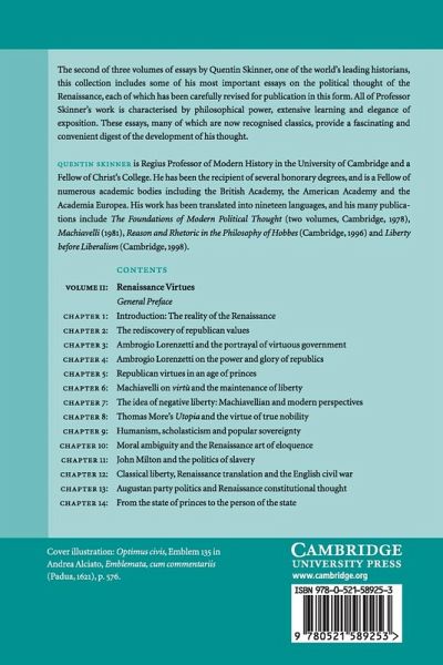 1. Introduction; 2. The rediscovery of republican values; 3. Ambrogio Lorenzetti and the portrayal of virtuous government; 4. Ambrogio Lorenzetti on the power and glory of republics; 5. Republican virtues in an age of princes; 6. Machiavelli on virtu and the maintenance of liberty; 7. The idea of negative liberty: Machiavelli and modern perspectives; 8. Thomas More's Utopia and the virtue of true nobility; 9. Was there a Calvinist theory of revolution? 10. Moral ambiguity and the renaissance art of eloquence; 11. John Milton and the politics of slavery; 12. Classical liberty, Renaissance translation and the English civil war; 13. From the state of princes to the modern state; 14. Augustan party politics and Renaissance constitutional thought.