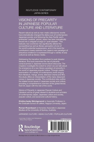 Foreword: Liberty and equality in Japan's unequal society 1. Towards an introduction: Japan's literature of precarity, Roman Rosenbaum 2. Kirino Natsuo's Metabola, or the Okinawan stage, fractured selves and the precarity of contemporary existence 3. Precarity, kawaii (cuteness), and their impact on environmental discourse in Japan 4. Part-timer, buy a house. Middle-class precarity, sentimentality and learning the meaning of work 5. Precarious attraction: Abe Kazushige's Individual Projection post-bubble 6. Hirabayashi Eiko and the projection of a viable proletarian vision 7.The Precarious Self: Love, melancholia and the eradication of adolescence in Makoto Shinkai's anime works 8. Graphic representation of the precariat in popular culture 9.Towards new literary trend: Contemporary Japanese society mirrored in literature 10. Cinematic Narratives of Precarity: Gender and Affect in Contemporary Japan 11. Precarity beyond 3/11 or 'Living Fukushima'--Power, politics, and space in Wagô Ryôichi's poetry of disaster