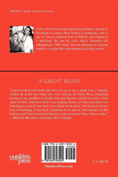 Stop! This is not your typical travel book on Venezuela; you won't find traditional reviews of restaurants, endless descriptions of places to visit, or rated accommodations. It's much, much more. An inspirational story about risk taking, Visions of Venezuela is about following one's muse, living life on the edge, experiencing every day as if it was your last. Everyone at one time or another has asked, "What if?" then returned to their regularly scheduled, myopic lives. Not this newlywed couple! Meet the Havilands, Joe and Alicia, who honeymooned on the windswept, palm tree punctuated Isle of Margarita in Venezuela and loved it so much that they went back to the same place to live and teach a year later. They were courageously living their dream: Venezuela or Bust! So, imagine if you will, this castaway couple selling everything they owned, including her beautiful emerald green Mustang convertible, putting their stuff in storage, and taking off to a foreign country, more than 4,000 miles away from their home, on a wing and a prayer, with their life savings and no job(s) waiting. That's what this companionable couple, both educators, did so daringly. Without any planned income and only a rented place to stay temporarily in Porlamar on the Island of Margarita, they threw caution to the wind and set sail on an adventure that made their family and friends marvel with delight. Little did this middle-age dynamic duo know that this was just the tip of the iceberg; it represented a new beginning of worldwide travel that would change their lives irrevocably, reeling them in hook, line, and sinker. It's a modern day Robinson Crusoe tale, couples-style, but instead of encountering cannibals, captives, and mutineers, Joe and Alicia met up with a plethora of unforgettable, compassionate people (both island natives and expats) and unexpected adventures that left them craving for more. It's a picture-perfect collection of entertaining anecdotes for both jetsetters and armchair travelers alike. Written in a sociable, conversational narrative, Visions of Venezuela is a must read, taking readers on a vicarious island tour de force. Fasten your seatbelts, turn your trays to the upright position, and prepare yourself for takeoff. This is your passport to travel into the lives of richly rendered characters, where you'll sight see the goings on of everyday island life on Margarita in this sybaritic symphony for the senses. Hear the barking dogs of Porlamar. Taste the gamey rooster soup from a road side stand. Smell the Caribbean lapping at your feet. See the shoeless, shirtless boy flamboyantly flying a homemade kite down a volcanic-red dirt road. Feel the warm, life-sustaining rain on your sun-kissed skin. And so much more. Leave your persnickety life behind, and take a much-needed vacation, one chapter at a time. You'll find the destination worth it, each and every time you pick up Visions of Venezuela to read. By book's end, it might even challenge you to make your own voyage of self-discovery and quite possibly land you in a faraway exotic place, where nothing is ordinary and anything can happen.
