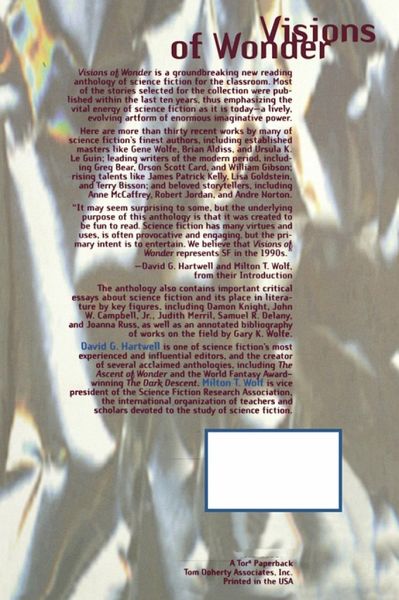 For years, those bringing SF into the classroom have had to improvise their course materials from anthologies and collections not designed for classwork. Now, David G. Hartwell, award-winning anthologist, and Professor Milton T. Wolf, Vice President of the Science Fiction Research Association, present a carefully selected reading anthology reflecting the SF field in all its modern diversity. Here are Golden Age writers like John W. Campbell and Jack Williamson, and here also are towering latter-day titans like Gene Wolfe and Ursula K. Le Guin, along with today's popular writers such as Greg Bear, Robert Jordan, and Vernor Vinge.