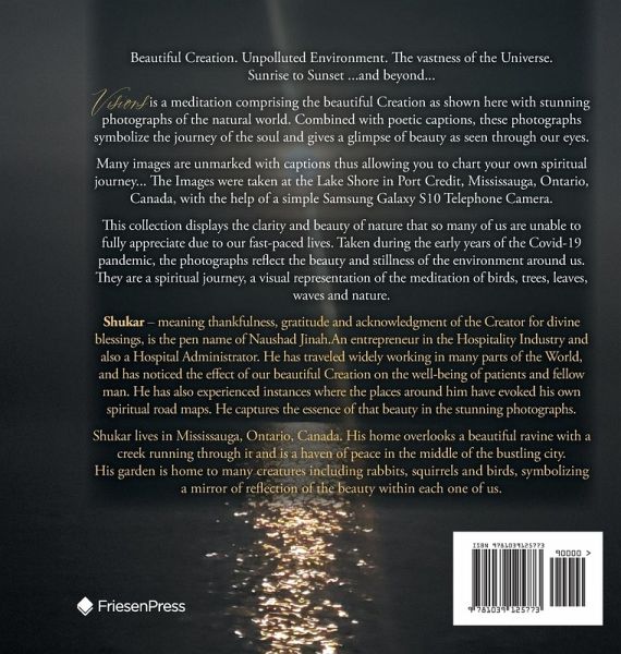 Beautiful Creation. Unpolluted Environment. The vastness of the Universe. Sunrise to Sunset ...and beyond... Visions is a meditation comprising the beautiful Creation as shown here with stunning photographs of the natural world. Combined with poetic captions, these photographs symbolize the journey of the soul and gives a glimpse of beauty as seen through our eyes. Many images are unmarked with captions thus allowing you to chart your own spiritual journey...The Images were taken at the Lake Shore in Port Credit, Mississauga, Ontario, Canada, with the help of a simple Samsung Galaxy S10 Telephone Camera. This collection displays the clarity and beauty of nature that so many of us are unable to fully appreciate due to our fast-paced lives. Taken during the early years of the Covid-19 pandemic, the photographs reflect the beauty and stillness of the environment around us. They are a spiritual journey, a visual representation of the meditation of birds, trees, leaves, waves and nature.