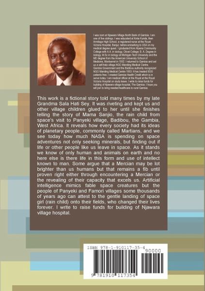 This fictional story was told many times by my late Grandma Sala Hati Sey. It was riveting and kept the village children glued to her until she finishes telling the story of Mama Sanjio, the rain child from space's visit to Panyeki village. It revealed villagers had ideas of planetary people, commonly called Martians. NASA is spending a lot on space adventures not seeking minerals and finding out if life or other people like us leave in space. We know of only human and animals on earth and no where else is there life in this form and use of intellect known to man. Some say a Mercian may be lot brighter than humans but that remains be proven right either through encountering a Mercian or the revealing of their capacity that excels ours. Artificial intelligence mimics fable space creatures but the people of Panyeki village, some thousands of years ago, can attest to gentle landing of space girl (rain child) onto their fields, changing their lives. I write to raise funds for building of Njawara village hospital.