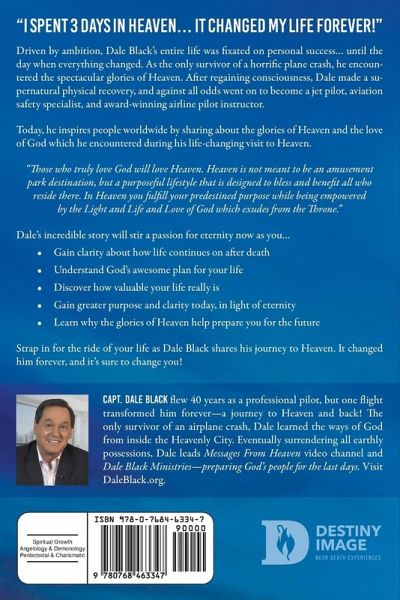 "I spent 3 days in Heaven... it changed my life forever!" Driven by ambition, Dale Black's entire life was fixated on personal success... until the day when everything changed. As the only survivor of a horrific plane crash, he encountered the spectacular glories of Heaven. After regaining consciousness, Dale made a supernatural physical recovery, and against all odds went on to become a jet pilot, aviation safety specialist, and award-winning airline pilot instructor. Today, he inspires people worldwide by sharing about the glories of Heaven and the love of God which he encountered during his life-changing visit to Heaven. "Those who truly love God will love Heaven. Heaven is not meant to be an amusement park destination, but a purposeful lifestyle that is designed to bless and benefit all who reside there. In Heaven you fulfill your predestined purpose while being empowered by the Light and Life and Love of God which exudes from the Throne." Dale's incredible story will stir a passion for eternity now as you... Gain clarity about how life continues on after death Understand God's awesome plan for your life Discover how valuable your life really is Gain greater purpose and clarity today, in light of eternity Learn why the glories of Heaven help prepare you for the future Strap in for the ride of your life as Dale Black shares his journey to Heaven. It changed him forever, and it's sure to change you!
