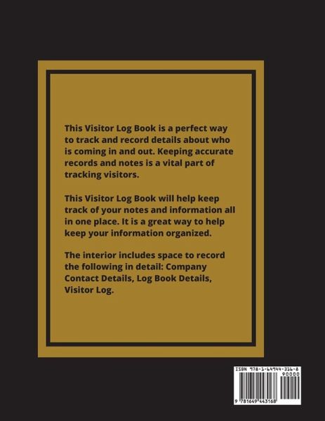 This Visitor Log Book notebook is a perfect and ideal way you can track and keep record of your visitors sign in and out. Each interior page contains space for writing the following: Company Contact Details - Write Company Name, Company Reg, Address, Email, Phone Number, Fax Number. Log Book Details - Write Log Start Date, Log End Date, Log Book Number, Notes. Visitor Log - Record Day, Name, To See, Time In, and Time Out. Great for the office. Simple and easy to use. Will also make a great gift. Get your copy today! Large size is 8.5x11 inches, 102 pages, quality white paper, black ink, soft matte finish cover, paperback.