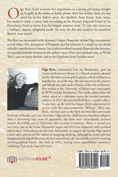 Olga Ilyin (Lita) recounts her experiences as a young girl being brought up frugally in the midst of family plenty. After her mother died, she was cared for by her father's sister, the idealistic Aunt Katya. Aunt Anna, her mother's sister, a career lady-in-waiting at the Russian Imperial Court in St. Petersburg, loved to invite Lita for longish summer visits. To Lita, the court was a brilliant, elegant, delightful world. Yet even she felt this world to be somehow flawed, even unreal. The flaw was incarnated in the demonic Gregory Rasputin, whom Olga encountered several times. Her description of Rasputin and his behavior is a small but no doubt valuable contribution to history; but in this novelized memoir, Rasputin also becomes an essential symbolic element in the author's story of her own spiritual crisis, as World War I casts its heavy shadow, and as the Expulsion from Paradise nears.