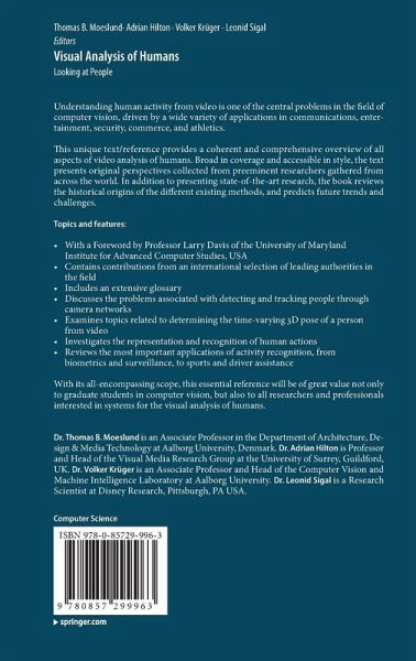 Dr. Thomas B. Moeslund is an Associate Professor in the Department of Architecture, Design & Media Technology at Aalborg University, Denmark. Dr. Adrian Hilton is Professor and Head of the Visual Media Research Group at the University of Surrey, Guildford, UK. Dr. Volker Krüger is an Associate Professor and Head of the Computer Vision and Machine Intelligence Laboratory at Aalborg University. Dr. Leonid Sigal is a Research Scientist at Disney Research, Pittsburgh, PA USA.