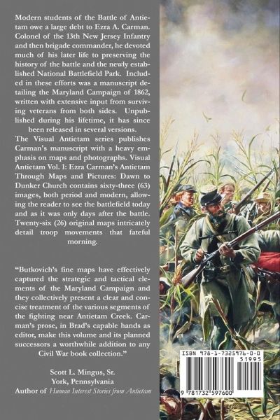 Modern students of the Battle of Antietam owe a large debt to Ezra A. Carman. Colonel of the 13th New Jersey Infantry and then brigade commander, he devoted much of his later life to preserving the history of the battle and the newly established National Battlefield Park. Included in these efforts was a manuscript detailing the Maryland Campaign of 1862, written with extensive input from surviving veterans from both sides. Unpublished during his lifetime, it has since been released in several versions. The Visual Antietam series publishes Carman's manuscript with a heavy emphasis on maps and photographs. Visual Antietam Vol. 1: Ezra Carman's Antietam Through Maps and Pictures: Dawn to Dunker Church contains sixty-three (63) images, both period and modern, allowing the reader to see the battlefield today and as it was only days after the battle. Twenty-six (26) original maps intricately detail troop movements that fateful morning.