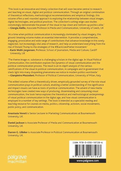 1 Introduction: Visual Political Communication (Darren G. Lilleker, Anastasia Veneti, Daniel Jackson).- Part I Theoretical and Methodological Issues in Visual Political Communication.- 2 The Digital Transformation of Visual Politics (Paul Messaris).- 3 The power of visual political communication: pictorial politics through the lens of communication psychology (Darren G. Lilleker).- 4 The Interdisciplinary Roots and Digital Branches of Visual Political Communication Research (Roman Gerodimos).- 5 Visual Methods for Political Communication Research: Modes and Affordances (Luc Pauwels, University of Antwerp).- Part II The Use of Visuals in Political Campaigning.- 6 From Analogue to Digital Negativity - Attacks and Counter-Attacks, Satire and Absurdism on Election Posters Offline and Online (Bengt Johansson, Christina Holtz-Bacha).- 7 Political parties and their pictures. Visual communication on Instagram in Swedish and Norwegian election campaigns (Uta Russmann, Jakob Svensson, AndersOlof Larsson).- 8 Visual Political Communication in Italian electoral campaigns (Edoardo Novelli).- Part III Visual Governance.- 9 The Visual Presidency of Donald Trump First Hundred Days: Political Image Making and Digital Media (Ryan T. Strand, Dan Schill).- 10 Greek Political Leaders on Instragram: Between 'soft' and 'hard' personalisation (Stamatis Poulakidakos, Iliana Giannouli).- 11The political power of smiling. How politicians' displays of happiness affect viewers' gaze behavior and political judgments (Michael Sülflow, Marcus Maurer).- Part IV Citizen-led Forms of Visual Political Communication.- 12 #MoreInCommon: Collective Mourning Practices on Twitter and the Iconisation of Jo Cox (Katy Parry).- 13 Picturing the political: Embodied visuality of protest imagery (Bolette B. Blaagaard).- 14 Connective Politics, Videos and Algorithms: YouTube's Mediation of Audiovisual Political Communication (Andrea Medrado, Simone do Vale, Adilson Cabral).