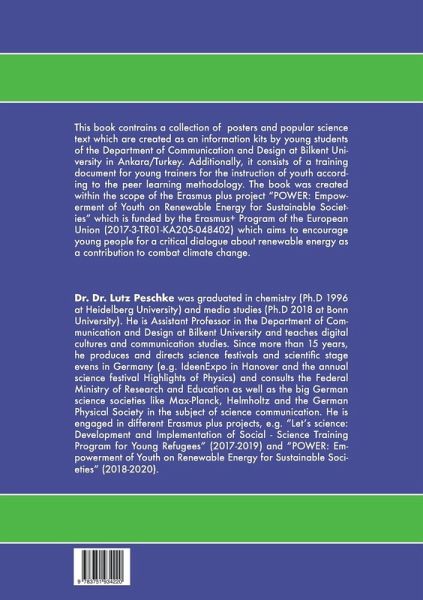 This book contrains a collection of posters and popular science text which are created as an information kits by young students of the Department of Communication and Design at Bilkent University in Ankara/Turkey. Additionally, it consists of a training document for young trainers for the instruction of youth according to the peer learning methodology. The book was created within the scope of the Erasmus plus project "POWER: Empowerment of Youth on Renewable Energy for Sustainable Societies" which is funded by the Erasmus+ Program of the European Union (2017-3-TR01-KA205-048402) which aims to encourage young people for a critical dialogue about renewable energy as a contribution to combat climate change.
