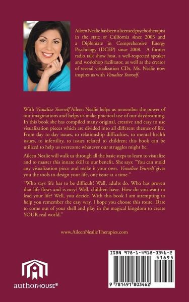 With Visualize Yourself Aileen Nealie helps us remember the power of our imaginations and helps us make practical use of our daydreaming. In this book she has compiled many original, creative and easy to use visualization pieces which are divided into all different themes of life. From day to day issues, to relationship difficulties, to mental health issues, to infertility, to issues related to children; this book can be utilized to help us overcome whatever our struggles might be. Aileen Nealie will walk us through all the basic steps to learn to visualize and to master this innate skill to our benefit. She says: "You can mold any visualization piece and make it your own. Visualize Yourself gives you the tools to design your life, one issue at a time." "Who says life has to be difficult? Well, adults do. Who has proven that life flows and is easy? Well, children have. How do you want to lead your life? Well, you decide. With this book I am attempting to help you remember the easy way. I hope you choose this route. Dare to come out of your shell and play in the magical kingdom to create YOUR real world. " www.AileenNealieTherapies.com