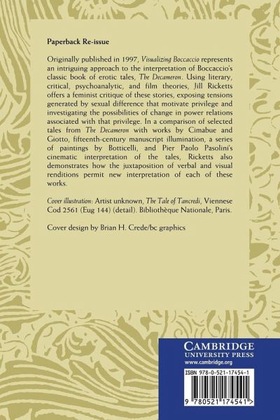 Originally published in 1997, Visualizing Boccaccio represents an intriguing approach to the interpretation of Boccaccio's classic book of erotic tales, The Decameron. Using literary, critical, psychoanalytic, and film theories, Jill Ricketts offers a feminist critique of these stories, exposing tensions generated by sexual difference that motivate privilege and investigating the possibilities of change in power relations associated with that privilege. In a comparison of selected tales from The Decameron with works by Cimabue and Giotto, fifteenth-century manuscript illumination, a series of paintings by Botticelli, and Pier Paolo Pasolini's cinematic interpretation of the tales, Ricketts also demonstrates how the juxtaposition of verbal and visual renditions permit new interpretation of each of these works.