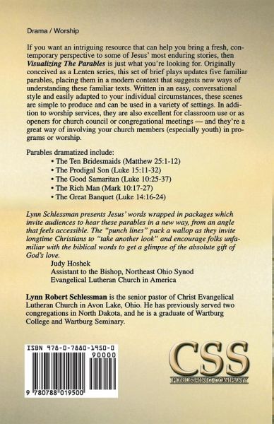 If you want an intriguing resource that can help you bring a fresh, contemporary perspective to some of Jesus' most enduring stories, then Visualizing The Parables is just what you're looking for. Originally conceived as a Lenten series, this set of brief plays updates five familiar parables, placing them in a modern context that suggests new ways of understanding these familiar texts. Written in an easy, conversational style and easily adapted to your individual circumstances, these scenes are simple to produce and can be used in a variety of settings. In addition to worship services, they are also excellent for classroom use or as openers for church council or congregational meetings -- and they're a great way of involving your church members (especially youth) in programs or worship. Parables dramatized include: * The Ten Bridesmaids (Matthew 25:1-12) * The Prodigal Son (Luke 15:11-32) * The Good Samaritan (Luke 10:25-37) * The Rich Man (Mark 10:17-27) * The Great Banquet (Luke 14:16-24) Lynn Schlessman presents Jesus' words wrapped in packages that invite audiences to hear these parables in a new way, from an angle that feels accessible. The "punch lines" pack a wallop as they invite longtime Christians to "take another look" and encourage folks unfamiliar with the biblical words to get a glimpse of the absolute gift of God's love. Judy Hoshek Assistant to the Bishop, Northeast Ohio Synod Evangelical Lutheran Church in America Lynn Robert Schlessman is the senior pastor of Christ Evangelical Lutheran Church in Avon Lake, Ohio. He has previously served two congregations in North Dakota, and he is a graduate of Wartburg College and Wartburg Seminary.