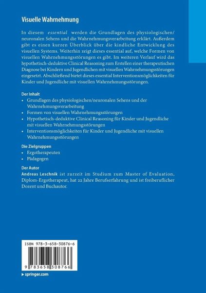 In diesem essential werden die Grundlagen des physiologischen/neuronalen Sehens und die Wahrnehmungsverarbeitung erklärt. Außerdem gibt es einen kurzen Überblick über die kindliche Entwicklung des visuellen Systems. Weiterhin zeigt dieses essential auf, welche Formen von visuellen Wahrnehmungsstörungen es gibt. Im weiteren Verlauf wird das hypothetisch-deduktive Clinical Reasoning zum Erstellen einer therapeutischen Diagnose bei Kindern und Jugendlichen mit visuellen Wahrnehmungsstörungen eingesetzt. Abschließend bietet dieses essential Interventionsmöglichkeiten für Kinder und Jugendliche mit visuellen Wahrnehmungsstörungen.