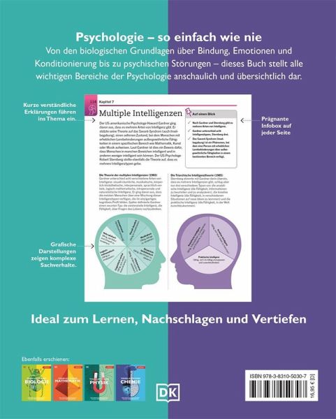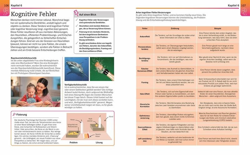Egal, ob wir Entscheidungen treffen oder mit anderen Menschen interagieren - unsere Psyche ist immer mit im Spiel. Dieses umfassende und leicht verständliche Buch enthält die Grundlagen der Psychologie und gibt Ihnen einen fundierten Überblick über die ganze Breite des Fachgebietes. Von Bindungsangst über bipolare Störungen bis hin zur Positiven Psychologie: In 17 Kapiteln werden alle wesentlichen Bereiche der Psychologie kompakt und strukturiert auf 1-2 Seiten dargestellt. Mit prägnanten Texten und ansprechenden Grafiken wird die komplexe Welt der Psychologie einfach erklärt. Visuelles Wissen: Psychologie eignet sich hervorragend für alle, die sich mit der Psychologie des Menschen vertraut machen möchten und eine anschauliche Einstiegslektüre suchen.
