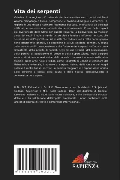 Vidarbha è la regione più orientale del Maharashtra con i bacini dei fiumi Wardha, Vainganga e Purna. Comprende le divisioni di Nagpur e Amaravti. La regione è una distesa collinare fittamente boscosa, intervallata da serbatoi artificiali, e possiede una notevole ricchezza mineraria. È una delle regioni più diversificate dello Stato per quanto riguarda la biodiversità. La maggior parte dei rettili è utile e rende un servizio silenzioso all'uomo nel controllo dei parassiti dell'agricoltura, sia insetti che roditori, ma i rettili come gruppo sono largamente ignorati, ad eccezione di alcuni serpenti dannosi. A causa della mancanza di consapevolezza sulla funzione dei serpenti nell'ecosistema circostante, della perdita di habitat, degli omicidi stradali, del bracconaggio, della perdita di popolazione di prede e della superstizione, molti serpenti sono stati vittime e resi vulnerabili durante i monsoni e meno nelle altre stagioni. Nelle aree rurali e tribali, come i distretti di Gondia e Bhandara del Maharashtra orientale, il numero di serpenti salvati dalle case e dai luoghi pubblici è molto basso, mentre un numero maggiore di serpenti viene ucciso dalle persone a causa della paura e della scarsa consapevolezza e conoscenza dei serpenti.