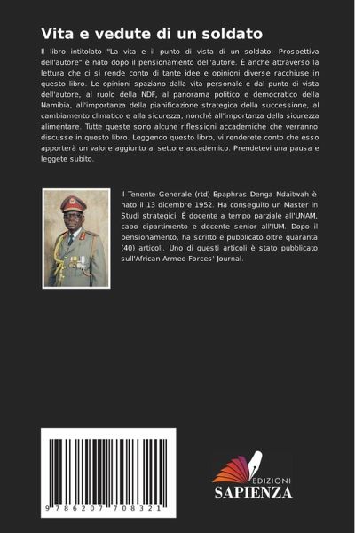 Il libro intitolato "La vita e il punto di vista di un soldato: Prospettiva dell'autore" è nato dopo il pensionamento dell'autore. È anche attraverso la lettura che ci si rende conto di tante idee e opinioni diverse racchiuse in questo libro. Le opinioni spaziano dalla vita personale e dal punto di vista dell'autore, al ruolo della NDF, al panorama politico e democratico della Namibia, all'importanza della pianificazione strategica della successione, al cambiamento climatico e alla sicurezza, nonché all'importanza della sicurezza alimentare. Tutte queste sono alcune riflessioni accademiche che verranno discusse in questo libro. Leggendo questo libro, vi renderete conto che esso apporterà un valore aggiunto al settore accademico. Prendetevi una pausa e leggete subito.