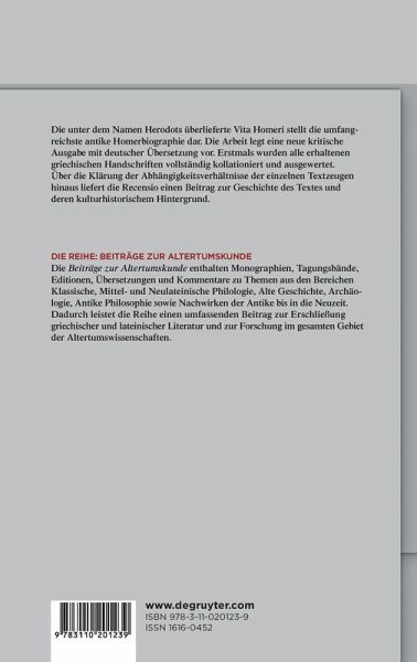 The Vita Homeri traditionally attributed to Herodotus is the most complete ancient biography of Homer. This volume presents a new critical edition together with a German translation. It is the first time that all extant Greek manuscripts have been fully collated and evaluated. As well as explaining the dependencies of the individual texts, the recensio provides a contribution to the history of the text and its cultural-historical background.
