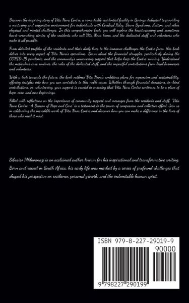 Discover the inspiring story of Vita Nova Centre, a remarkable residential facility in Springs dedicated to providing a nurturing and supportive environment for individuals with Cerebral Palsy, Down Syndrome, Autism, and other physical and mental challenges. In this comprehensive book, you will explore the heartwarming and sometimes heart-wrenching stories of the residents who call Vita Nova home, and the dedicated staff and volunteers who make it all possible. From detailed profiles of the residents and their daily lives to the immense challenges the Centre faces, this book delves into every aspect of Vita Nova's operations. Learn about the financial struggles, particularly during the COVID-19 pandemic, and the community's unwavering support that helps keep the Centre running. Understand the meticulous care routines, the roles of the dedicated staff, and the impactful contributions from local businesses and volunteers. With a look towards the future, the book outlines Vita Nova's ambitious plans for expansion and sustainability, offering insights into how you can contribute to this noble cause. Whether through financial donations, in-kind contributions, or volunteering, your support is crucial in ensuring that Vita Nova Centre continues to be a place of hope, care, and new beginnings. Filled with reflections on the importance of community support and messages from the residents and staff, "Vita Nova Centre : A Beacon of Hope and Care" is a testament to the power of compassion and collective effort. Join us in celebrating the incredible work of Vita Nova Centre and discover how you can make a difference in the lives of those who need it most.