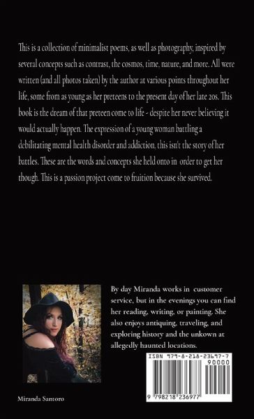 This is a collection of minimalist and acrostic poems, as well as photography, inspired by several concepts including contrast, the cosmos, time, nature, and more. All were written by the same author at various points throughout her life, some from as young as her preteens to the present day of her late 20s. This book is the dream of that preteen come to life - despite her never believing it would actually happen. The expression of a young woman battling a debilitating mental health disorder and addiction, this book isn't the story of her battles. These are the words and concepts she held onto to get her through. A passion project come to fruition because she survived.