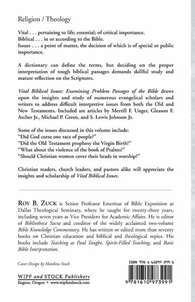 Vital . . . pertaining to life; essential; of critical importance. Biblical . . . in or according to the Bible. Issues . . . a point of mater, the decision of which is of special or public importance. A dictionary can define the terms, but deciding on the proper interpretation of tough biblical passages demands skillful study and mature reflection on the Scriptures. Vital Biblical Issues: Examining Problem Passages of the Bible draws upon the insights and study of numerous evangelical scholars and writers to address difficult interpretive issues from both the Old and New Testaments. Included are articles by Merrill F. Unger, Gleason F. Archer Jr., Michael P. Green, and S. Lewis Johnson Jr. Some of the issues discussed in this volume include: ""Did God curse one race of people?"" ""Did the Old Testament prophesy the Virgin Birth?"" ""What about the violence of the book of Psalms?"" ""Should Christian women cover their heads in worship?"" Christian readers, church leaders, and pastors alike will appreciate the insights and scholarship of Vital Biblical Issues.