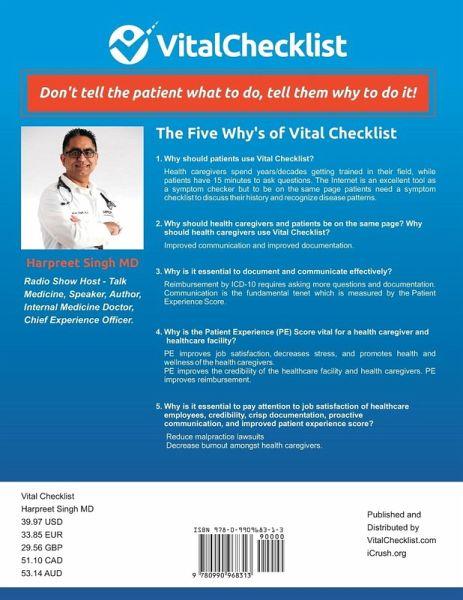 The Five Why’s of Vital Checklist Why should patients use Vital Checklist? Health caregivers spend years/decades in getting trained in their field, while patients have 15 minutes to ask questions. The Internet is an excellent tool as a symptom checker but to be on the same page; patients need a symptom checklist to discuss their history and recognize disease patterns. Why should health caregivers and patients be on the same page? Why should health caregivers use Vital Checklist? Improved communication and improved documentation. Why is it essential to document and communicate effectively? Reimbursement by ICD-10 requires asking more questions and documentation. Communication is the fundamental tenet which is measured by Patient Experience Score. Why is the Patient Experience (PE) Score vital for a health caregiver and healthcare facility? PE improves job satisfaction, decreases stress, and promotes health and wellness of the health caregivers. PE improves the credibility of the healthcare facility and health caregivers. PE improves reimbursement. Why is it essential to pay attention to job satisfaction of healthcare employees, credibility, crisp documentation, proactive communication, and improved patient experience score? Reduce malpractice lawsuits Decrease burnout amongst health caregivers.
