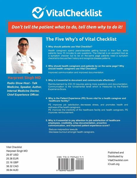 The Five Why’s of Vital Checklist Why should patients use Vital Checklist? Health caregivers spend years/decades in getting trained in their field, while patients have 15 minutes to ask questions. The Internet is an excellent tool as a symptom checker but to be on the same page; patients need a symptom checklist to discuss their history and recognize disease patterns. Why should health caregivers and patients be on the same page? Why should health caregivers use Vital Checklist? Improved communication and improved documentation. Why is it essential to document and communicate effectively? Reimbursement by ICD-10 requires asking more questions and documentation. Communication is the fundamental tenet which is measured by Patient Experience Score. Why is the Patient Experience (PE) Score vital for a health caregiver and healthcare facility? PE improves job satisfaction, decreases stress, and promotes health and wellness of the health caregivers. PE improves the credibility of the healthcare facility and health caregivers. PE improves reimbursement. Why is it essential to pay attention to job satisfaction of healthcare employees, credibility, crisp documentation, proactive communication, and improved patient experience score? Reduce malpractice lawsuits Decrease burnout amongst health caregivers.