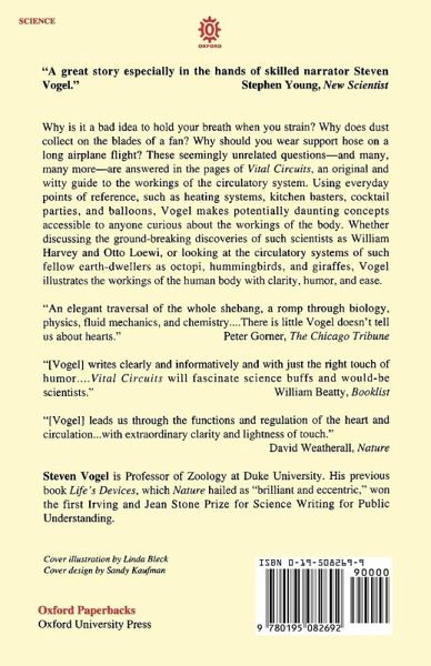 Vogel is a master at using everyday points of reference to illustrate potentially daunting concepts. Heating systems, kitchen basters, cocktail parties, balloons-all are pressed into service. And we learn not only such practical information as why it's a bad idea to hold your breath when you strain and why you might want to wear support hose on a long airplane flight, but also the answers to such seemingly unrelated issues as why duck breasts (but not chicken breasts) have dark meat and why dust accumulates on the blades of a fan. But the real fascination of Vital Circuits lies neither in its practical advice nor in its trivia. Rather, it is in the detailed picture we construct, piece by piece, of our extraordinary circulatory system. What's more, the author communicates not just information, but the excitement of discovering information. In doing so, he reveals himself to be an eloquent advocate for the cause of science as the most interesting of the humanities. Anyone curious about the workings of the body, whether afflicted with heart trouble or addicted to science watching, will find this book a goldmine of information and delight.