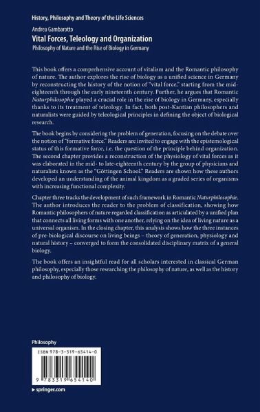 This book offers a comprehensive account of vitalism and the Romantic philosophy of nature. The author explores the rise of biology as a unified science in Germany by reconstructing the history of the notion of "vital force," starting from the mid-eighteenth through the early nineteenth century. Further, he argues that Romantic Naturphilosophie played a crucial role in the rise of biology in Germany, especially thanks to its treatment of teleology. In fact, both post-Kantian philosophers and naturalists were guided by teleological principles in defining the object of biological research.
