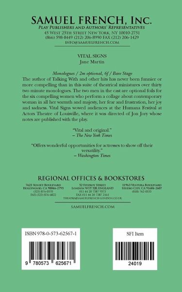 Monologues / Characters: 2 male (optional), 6 f Scenery: Bare stage The author of Talking With and other hits has never been funnier or more compelling than in this suite of theatrical miniatures over thirty two minute monologues. The two men in the cast are optional foils for the six compelling women who perform a collage about contemporary woman in all her warmth and majesty, her fear and frustration, her joy and sadness. Vital Signs wowed audiences at the Humana Festival at Actors Theatre