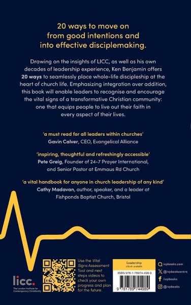 Everyone knows disciplemaking in churches is important - vital, even. But how do we move from good intentions to real transformation? Drawing on LICC's engagement with thousands of UK churches and his decades of experience as a church leader, Ken Benjamin offers 20 ways to put whole-life discipleship at the heart of our churches - 20 vital signs of disciplemaking life. Together, they'll help you grow a culture that equips people to live out their faith in every part of life, not just through church activities. The key is not to add to our stretched to-do lists, but to permeate everything we already do with new, refreshing perspective. Whole-life disciplemaking should be embedded rather than added, built in rather than bolted on. When this happens, the effect is life-changing - not only for congregations and church leaders but for the individuals, organisations and places they seek to serve. Vital Signs works in tandem with LICC's online assessment tool, training videos and resources to help leadership teams assess, embed and maintain whole-life discipleship in the churches they serve. Discover more at licc.org.uk/vitalsigns .
