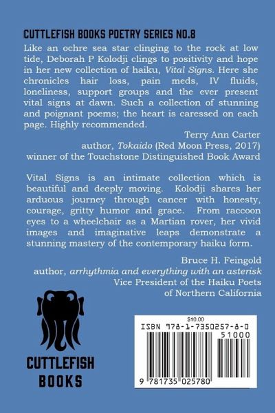 Vital Signs is a collection of haiku and scifaiku by Deborah P Kolodji. Centered on biographical images chronicling her fight against cancer, Vital Signs is a collection that is both gut-wrenchingly poignant and heartwarmingly inspirational.