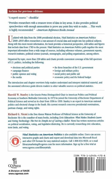 There is no other print source, online source, or Web search engine that provides the wide range and depth of insight found in Vital Statistics on American Politics. This new edition is updated with the most recent information available. What sets this book apart is the experience of editors Harold Stanley and Richard Niemi. These scholars consult hundreds of sources to calculate and locate the data, facts, and figures that offer a vivid and multifaceted portrait of the broad spectrum of United States politics and policies. In over 230 tables and figures, students, professional researchers, and interested citizens will find chapters devoted to key subject areas such as elections and political parties, public opinion and voting, the media, the three branches of U.S. government, foreign, military, social and economic policy, and much more. For depth of information and ease of use, this volume is the best resource of its kind available and should be a key component of all academic and large public library collections.