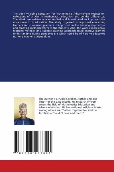 The book Vitalizing Education for Technological Advancement focuses on collections of articles in mathematics education and gender differences. The Work are written articles studied and investigated to improved the advancement of education. The study is geared to improved educators, learners and curriculum planners to improved on the learning approaches and teaching methods offers to the students. Also, the work exposes how teaching methods or a suitable teaching approach could improve learners understanding during pandemic Era which could be of help to educators not only mathematicians alone.