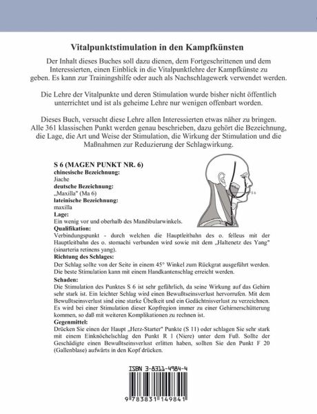 Der Inhalt dieses Buches soll dazu dienen, den Frotgeschritttenen und dem Interessierten, einen Einblick in die Vitalpunktlehre der Kampfkünste zu geben. Es kann zur Trainingshilfe oder auch als Nachschlagewerk verwendet werden. Die Lehre der Vitalpunkte und deren Stimulation wurde bisher nicht öffentlich unterrichtet und ist als geheime Lehre nur wnigen offenbart worden. Dieses Buch, versucht diese Lehre allen Interessierten etwas näher zu bringen. Alle 361 klassischen Punkte werden genau beschrieben, dazu gehört die Beziehung, die Lage, die Art und die Weise der Stimulation, die Wirkung der Stimulation und die Maßnahmen zur Reduzierung der Schlagwirkung.S 6 (Magen Punkt Nr. 6) chinesische Bzeichnung:Jiachedeutsche Bezeichnung:"Maxilla" (Ma6)lateinische Bezeichnung:maxillaLage:Ein wenig vor und oberhalb des Mandibularwinkels.Qualifikation:Verbindungspunkt - durch welchen die Hauptleitbahn des o. felleus mit der Hauptleitbahn des o. stomachi verbunden wird sowie mit dem "Haltenetz des Yang" (sinarteria retinens yang).Richtung des Schlages:Der Schlag sollte von der Seite in einem 45 Grad Winkel zum Rückengrat ausgeführt werden. Die beste Stimulation kann mit einem Handkantenschlag erreicht werden.Schadeb:Die Stimulations des Punktes S 6 ist sehr gefährlich, da seine Wirkkung auf das Gehirn sehr stark ist. Ein leichter Schlag wird einen Bewußtseinsverlust hervorrufen. Mit dem Bewußtseinsverlust sind eine starke Übelkeit und ein Gedächtnisverlust zu verzeichnen. Es wird bei einer Stimulation dieser Kopfregion immer zu einer Gehirnerschütterung kommen, so daß mit weiteren Komplikationen zu rechnen ist.Gegenmittel:Drücken Sie einen der Haupt "Herz-Starter" Punkte (S11) oder schlagen Sie sehr stark mit einem Einknöchelschlag den Punkt R 1 (Niere) unter dem Fuß. Sollte der Geschädigte einen Bewußtseinsverlust erlitten haben, sollten Sie den Punkt F 20 (Gallenblase) aufwärts in den Kopf drücken.